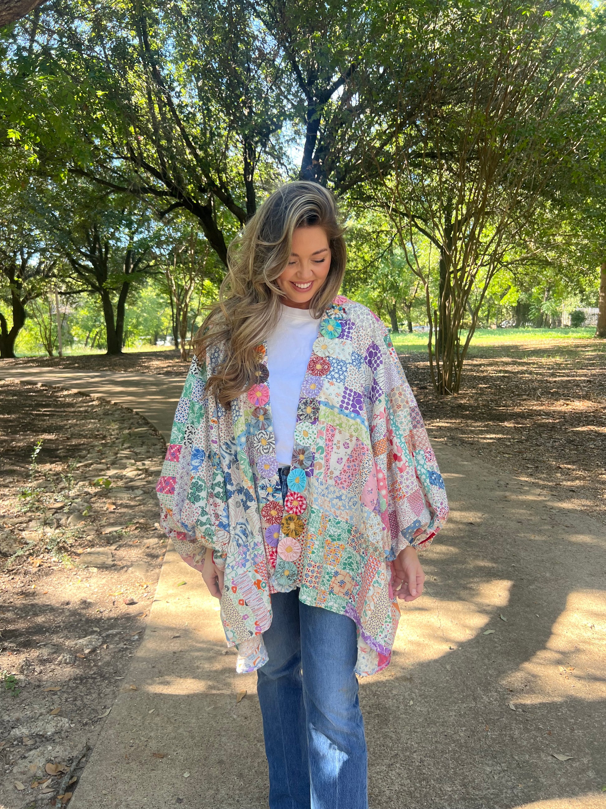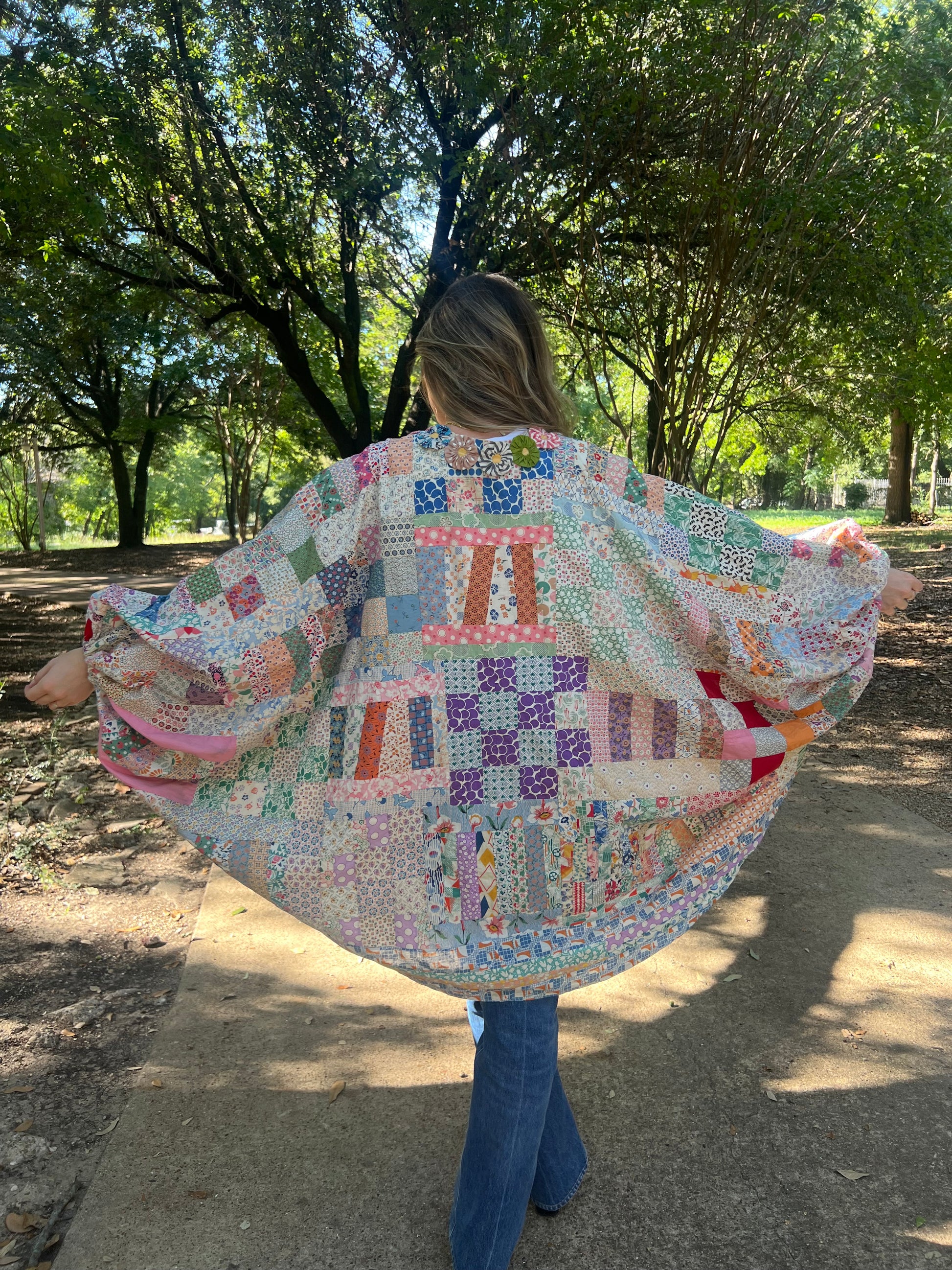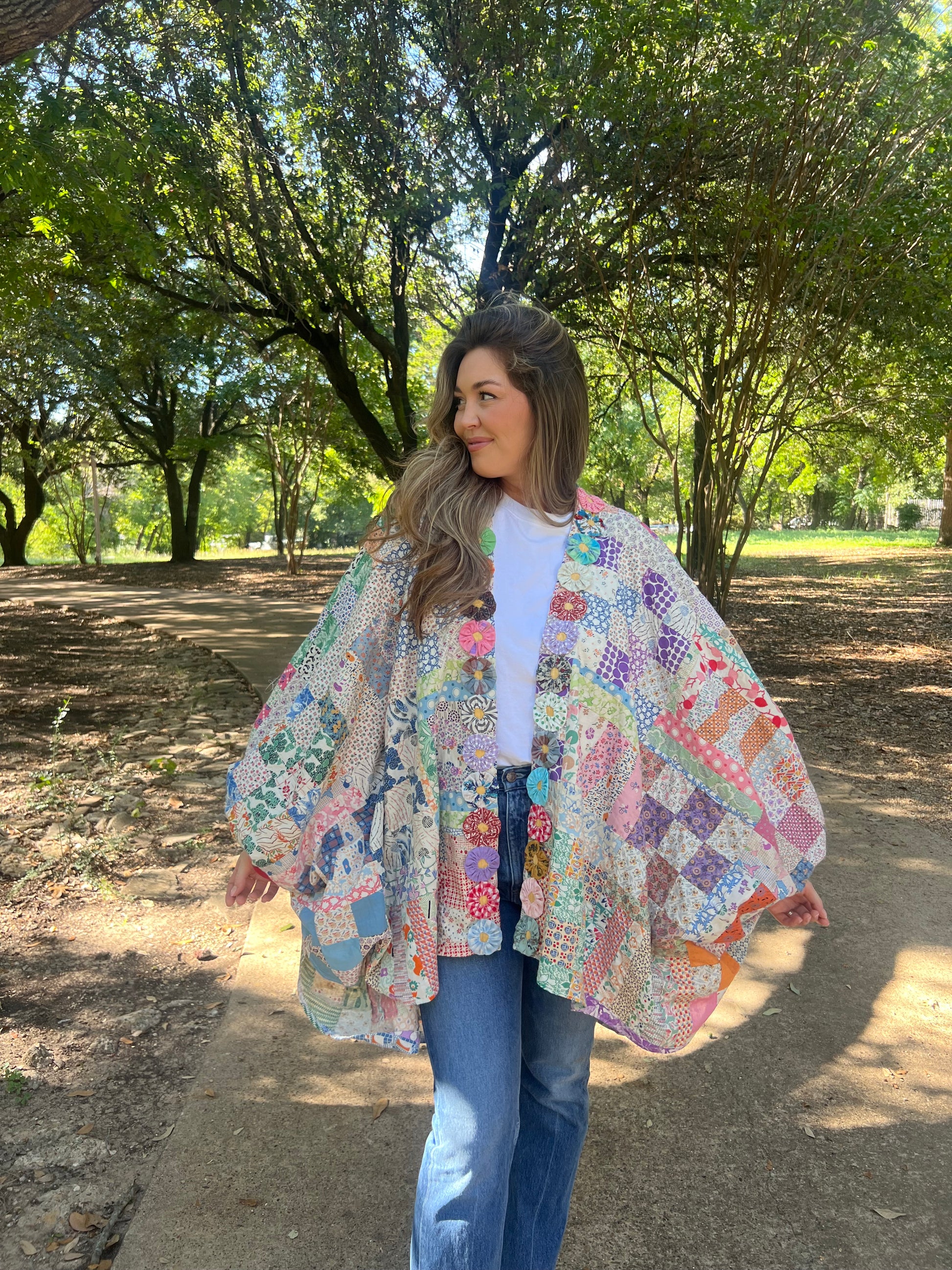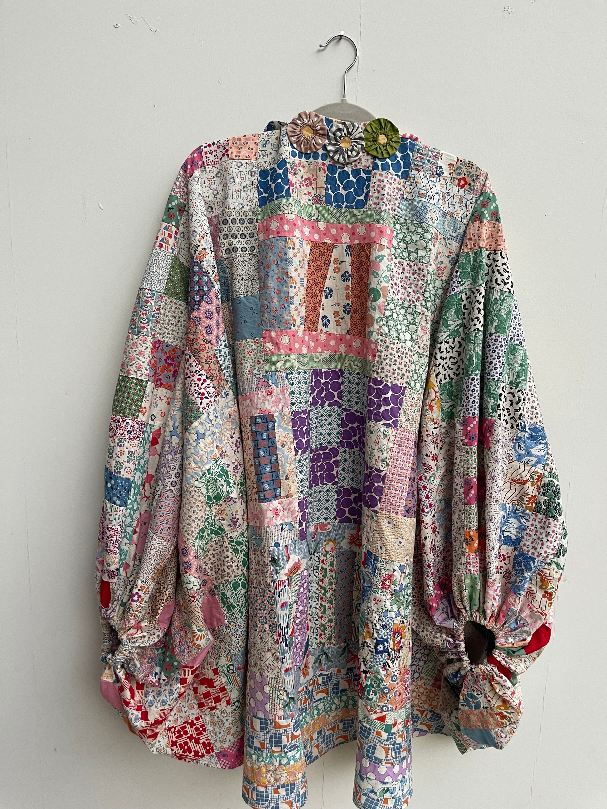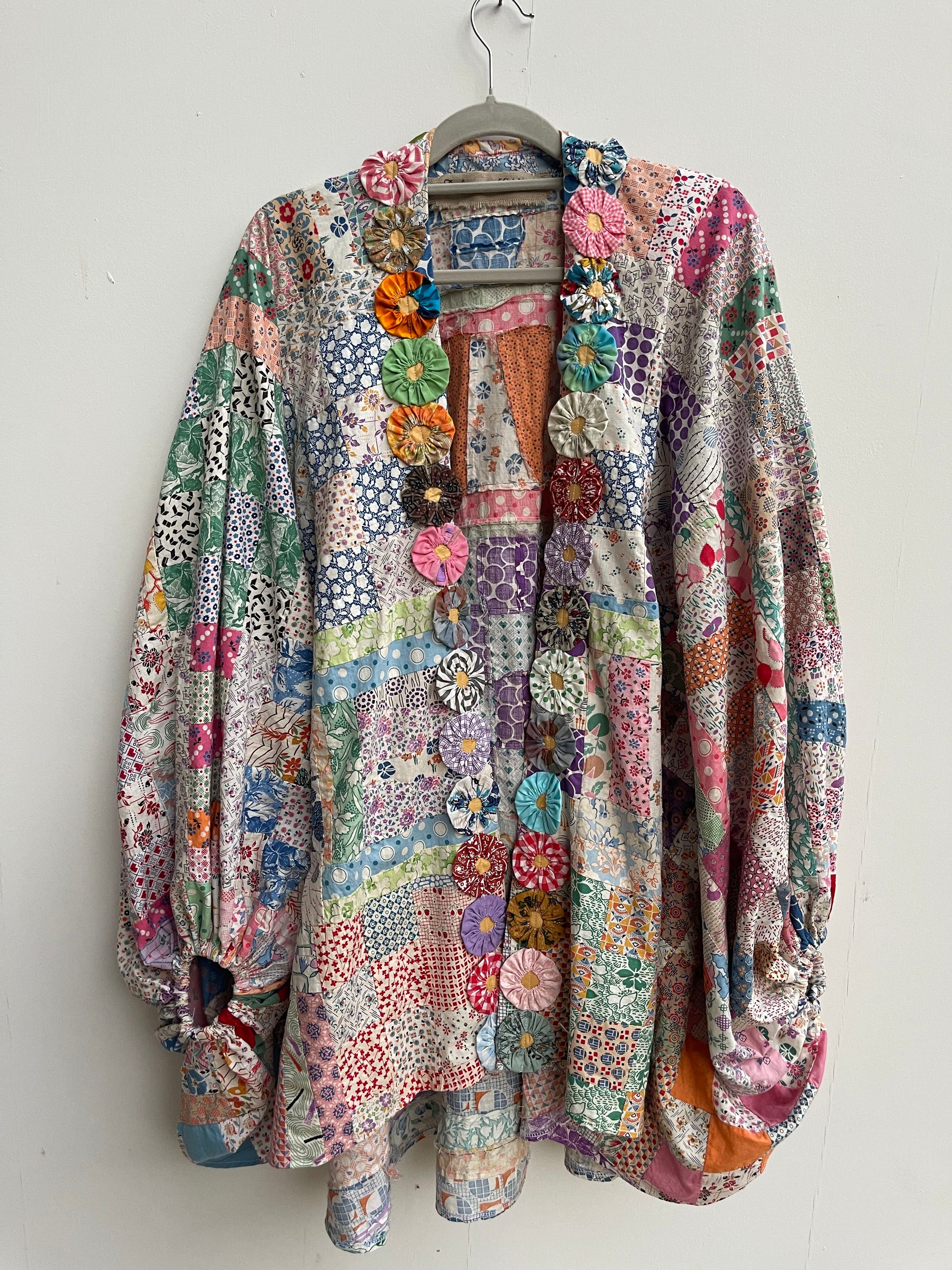 Quilt topper voluminous sleeve and yoyo trim